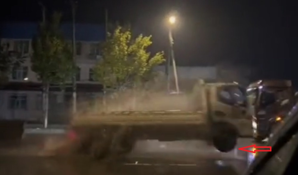 Theo clip, trên một đoạn đường ngập nước lúc trời tối, một chiếc xe ô tô tải lao nhanh qua trong khi hàng dài các xe ô tô khác xếp hàng thận trọng di chuyển.