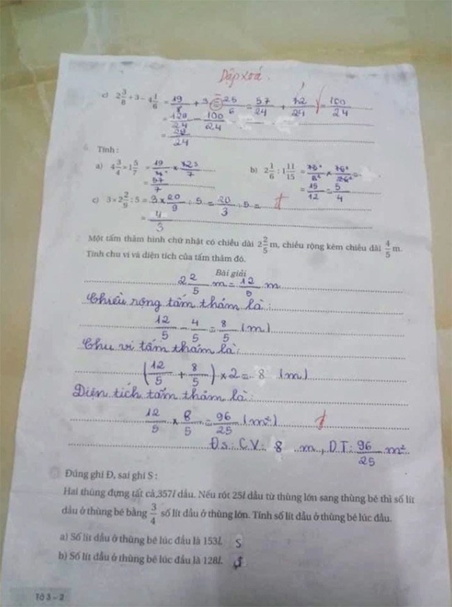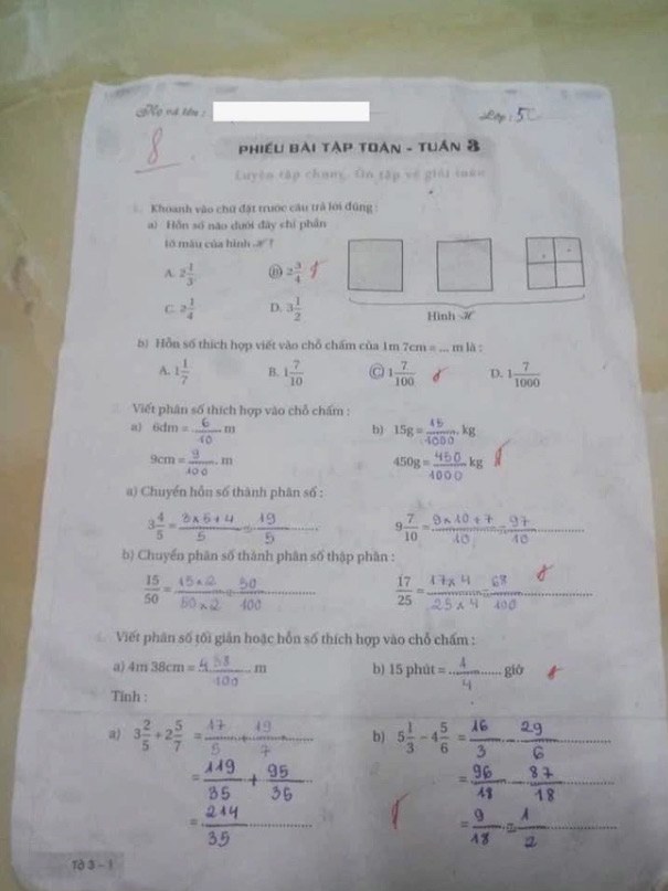 Bài làm của học sinh lớp 5 môn Toán chỉ đạt 8 điểm với lý do được cho là tẩy xoá.