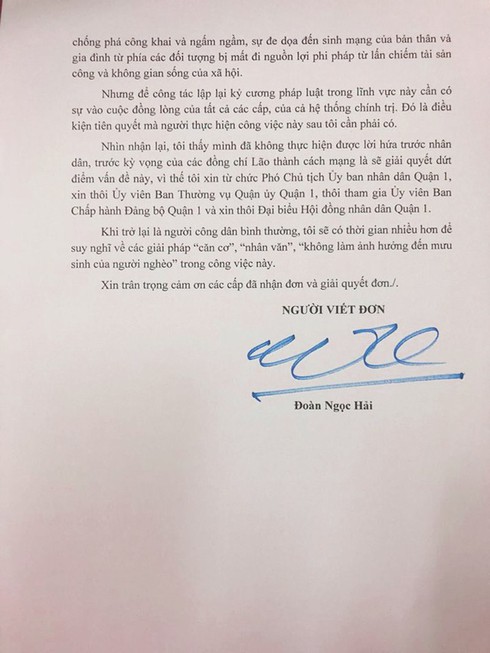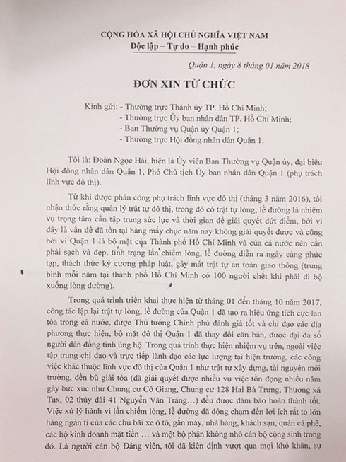 "Từ tháng 1 đến tháng 10-2017, công tác lập lại trật tự lòng, lề đường quận 1 đã tạo hiệu ứng lớn cho cả nước, Thủ tướng Chính phủ đánh giá tốt và chỉ đạo các địa phương khác thực hiện", ông Hải viết trong đơn.