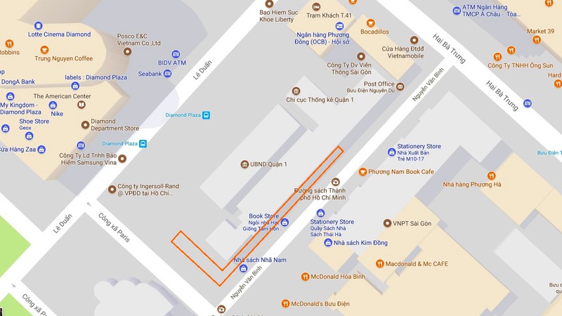 Trong khi đó ông Hải nhấn mạnh rằng bãi xe này chỉ phục vụ công chức và người dân đến làm việc tại quận, do đó chủ bãi tổ chức thu phí là việc "không thể chấp nhận được". Khi PV đặt câu hỏi rằng việc này có thể ảnh hưởng đến những người gửi xe để vào đường sách, Phó chủ tịch quận 1 cho biết người dân có thể đến đây bằng các phương tiện công cộng chứ không nhất thiết phải đi xe máy. Trong ảnh là vị trí bãi xe (đường màu cam) tồn tại nhiều năm nay. Ảnh: Google Maps. |