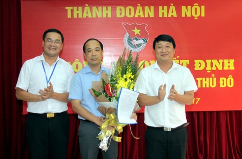 Đồng chí Nguyễn Khánh Bình, UVBCH Trung ương Đoàn, Phó Bí thư Thường trực Thành đoàn và đồng chí Nguyễn Ngọc Việt, UVBCH Trung ương Đoàn, Phó Bí thư Thành đoàn TP Hà Nội trao quyết định và tặng hoa chúc mừng tân Tổng Biên tập Báo Tuổi trẻ Thủ đô Nguyễn Mạnh Hưng. |