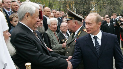Ông Boris Yeltsin (trái) bắt tay ông Vladimir Putin. |