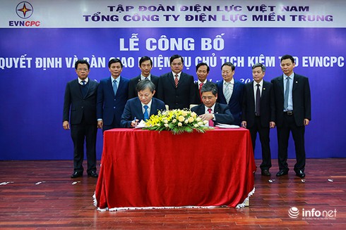 Ông Trần Đình Nhân và ông Võ Quang Lâm (phải) ký biên bản bàn giao nhiệm vụ Chủ tịch kiểm Tổng Giám đốc EVNCPC |
