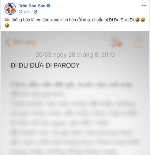 Trước đó, chưa đầy 1 giờ sau khi Bích Phương ra MV “Đi đu đưa đi”, BB Trần cho biết anh đã kịp làm xong kịch bản parody của mình.