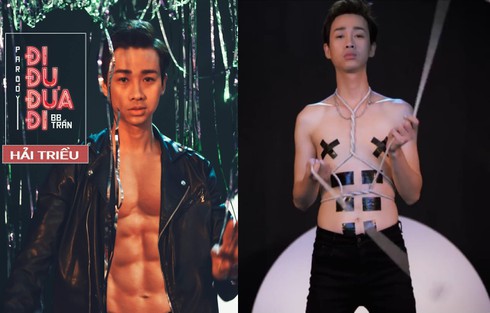 Hình ảnh body "2 thái cực" của Hải Triều trong và ngoài parody.Trong bản parody, BB Trần khẳng định Hải Triều "trai thẳng" 100%. |