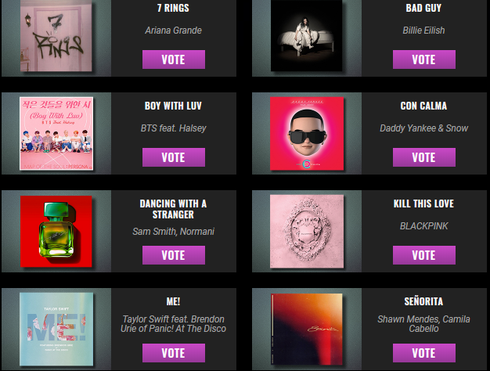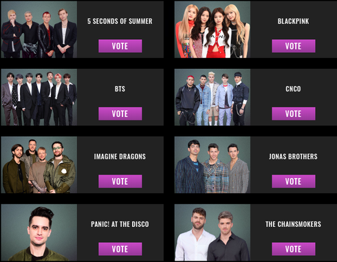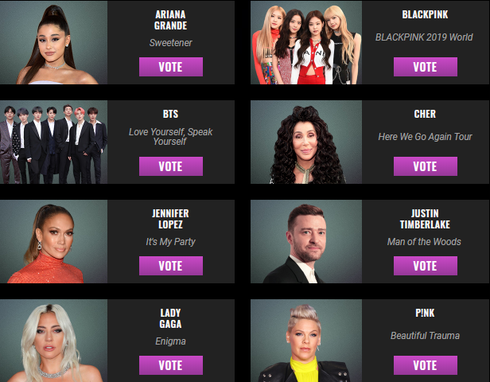 Năm nay hai đại diện Kpop góp mặt là BTSvà Black Pink. Cả hai nhóm nhạc cùng được đề cử ở 3 hạng mục là Nhóm nhạc của năm 2019, MV của năm 2019 và Tour diễn của năm 2019.