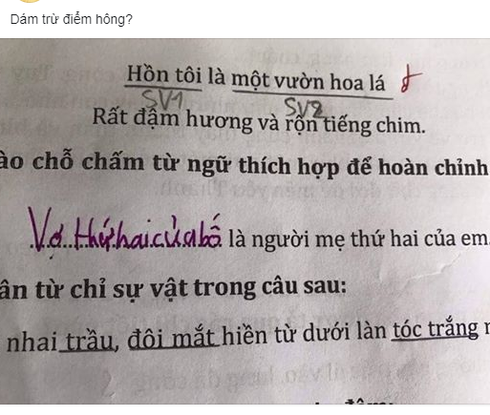 Nội dung câu hỏi: ".....là người mẹ thứ hai của em" và yêu cầu học sinh điền từ vào chỗ ba chấm. Đáp án chính xác sẽ là "cô giáo là người mẹ thứ 2 của em". Tuy nhiên, câu trả lời của học sinh lại là "vợ thứ 2 của bố là người mẹ thứ hai của em".