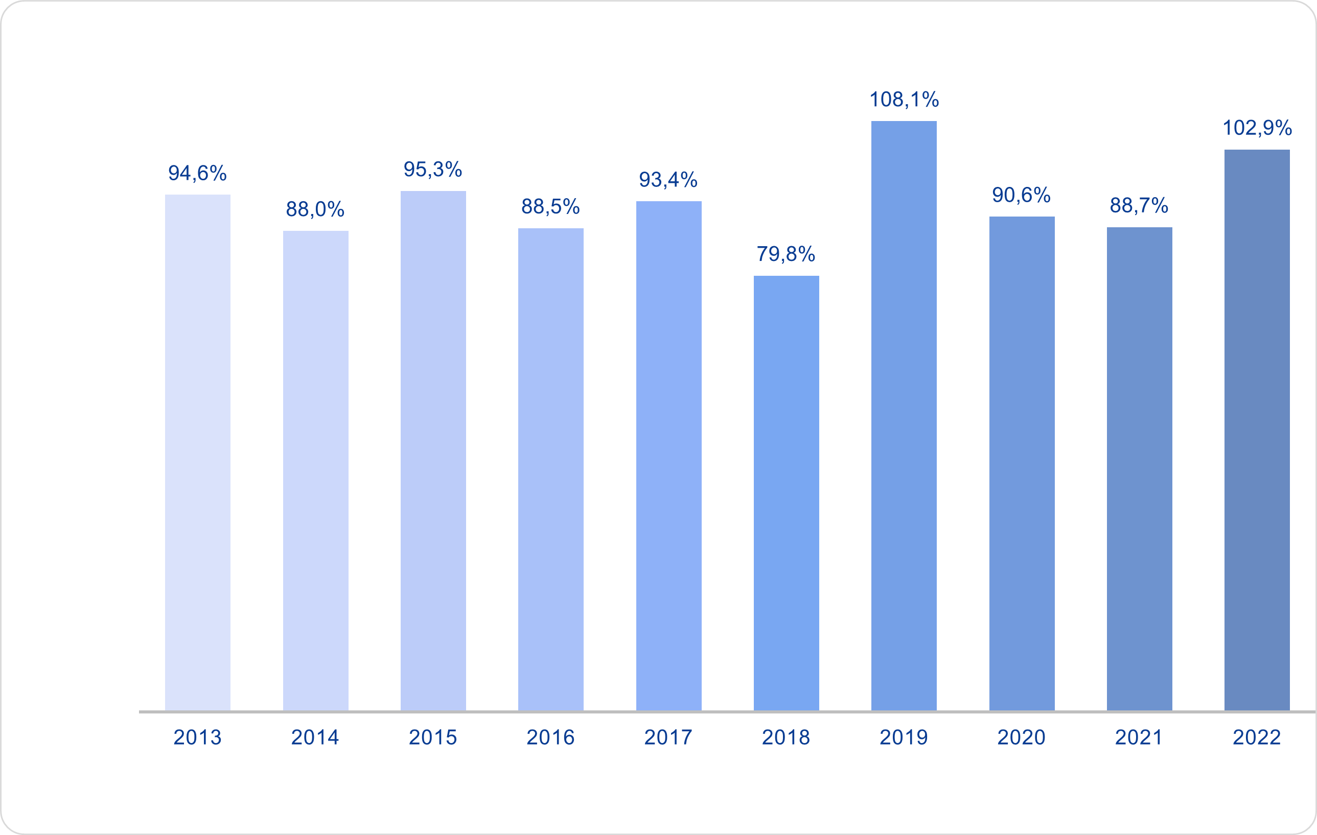 2022 là năm nhiều mặt hàng sữa nguyên liệu tăng giá kỷ lục, thậm chí có nhóm tăng đến 100%. Cùng với đó, giá cước vận chuyển, thức ăn chăn nuôi, phân bón tăng đẩy chi phí sản xuất lên cao. Tuy nhiên, Vinamilk vẫn có thể duy trì chỉ số Dòng tiền từ hoạt động kinh doanh/lợi nhuận sau thuế ổn định ở mức cao. Không những thế, 2022 là năm mà chỉ số này cao thứ hai và cao nhất từ sau đại dịch COVID-19.