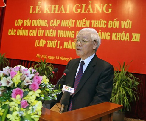 Hôm nay, tôi rất vui mừng đến dự lễ khai giảng lớp bồi dưỡng, cập nhật kiến thức đối với các đồng chí Ủy viên Trung ương Đảng khoá XII. Tôi được biết đây là lớp thứ nhất; cuối tháng 8 này, sẽ tổ chức lớp thứ hai. Trước hết, tôi xin thay mặt Bộ Chính trị, Ban Bí thư và với tình cảm cá nhân, nhiệt liệt chào mừng các đồng chí đã về dự đông đủ. Hoan nghênh Ban Tổ chức Trung ương, Học viện Chính trị quốc gia Hồ Chí Minh, Hội đồng Lý luận Trung ương, Văn phòng Trung ương Đảng và các cơ quan, ban, ngành có liên quan vừa qua đã phối hợp chặt chẽ, tích cực chuẩn bị để chúng ta tổ chức khai mạc lớp bồi dưỡng quan trọng này theo đúng kế hoạch.