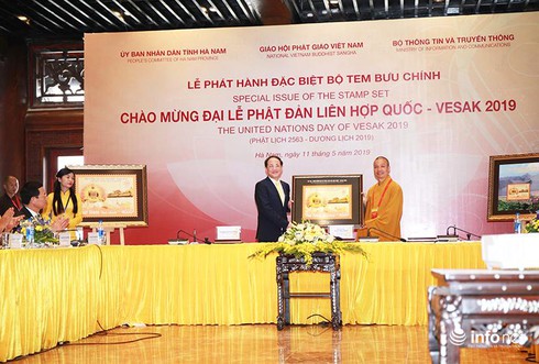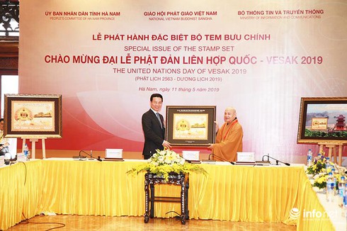 Bộ trưởng Bộ TT&TT Nguyễn Mạnh Hùng, Chủ tịch UBND tỉnh Hà Nam Nguyễn Xuân Đông và Hòa thượng Thích Thiện Nhơn - Chủ tịch Hội đồng Trị sự, Giáo hội Phật giáo Việt Nam cùng thực hiện nghi thức ký phát hành đặc biệt bộ tem "Chào mừng Đại lễ Phật đản Liên hợp quốc - Vesak 2019". |