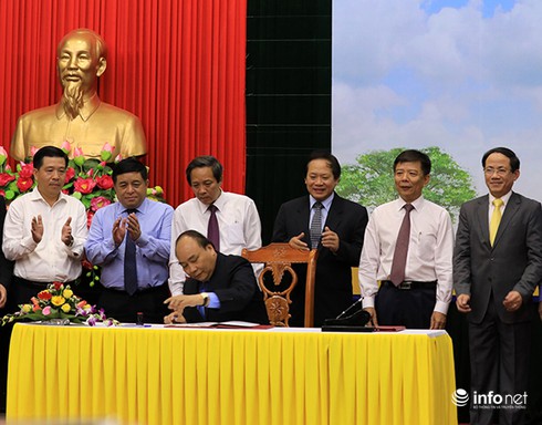 | Thủ tướng Chính phủ Nguyễn Xuân Phúc thực hiện nghi thức đóng dấu phát hành đặc biệt bộ tem về Đại tướng Võ Nguyên Giáp |