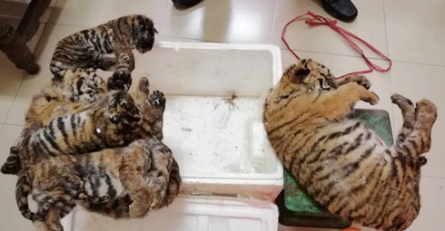 5 cá thể hổ con (đã chết) được giấu kỹ trong thùng xốp. |