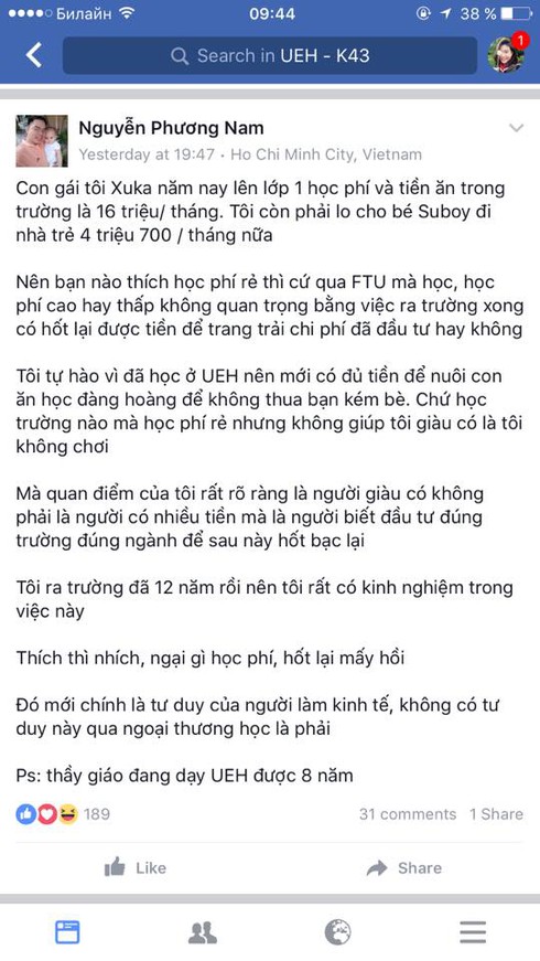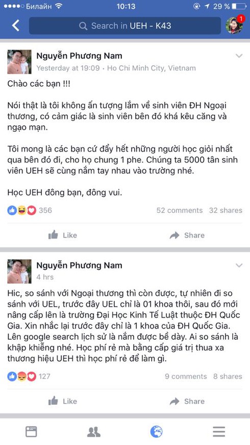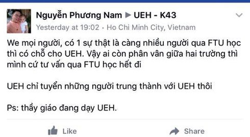 Trên trang facebook cá nhân mang tên Nguyễn Phương Nam, tự nhận là giảng viên ĐH Kinh tế TP.HCM liên tục có những bài đăng với nội dung chê bai, “dìm hàng” Đại học Ngoại thương và nâng tầm của Đại học Kinh tế TP.HCM với những thông tin như: “Ngày xưa, khi nghĩ tới học kỹ sư, người ta nghĩ tới Đại học Bách khoa, còn muốn học kinh doanh làm giàu thì nghĩ đến học Đại học Kinh tế chứ có ai biết Đại học Ngoại thương nằm ở đâu. Bởi vậy, có người nghĩ mình dìm hàng FTU (ĐH Ngoại thương) vì ngày xưa mình rớt FTU. Xin lỗi, FTU chỉ mới phất lên mấy năm gần đây do tuyển ít nên điểm chuẩn cao. Điểm chuẩn UEH (Đại học Kinh tế) thấp hơn không phải vì UEH kém hơn mà vì lấy hàng ngàn sinh viên. Thử hỏi UEH tuyển số lượng như FTU thì…