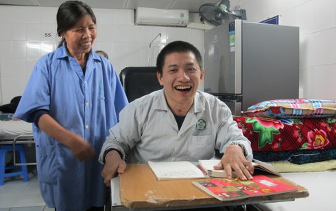 Anh Hải cùng mẹ tại Trung tâm Phục hồi chức năng, Bệnh viện Bạch Mai. Ảnh: Nam Phương. |