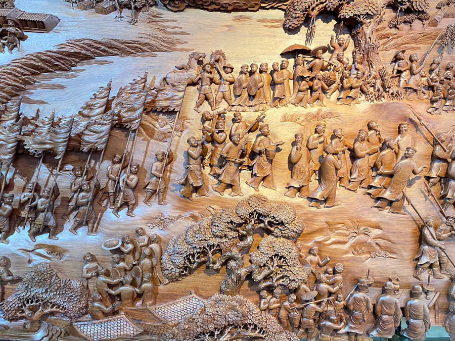 Bức tranh dài 8,33m, cao 1,7m và dày 16cm. Anh Bùi Trọng Quân cho hay, điểm độc đáo của bức tranh là được làm trên gỗ Cẩm Lai Nam Phi liền khối, nặng 2 tấn.