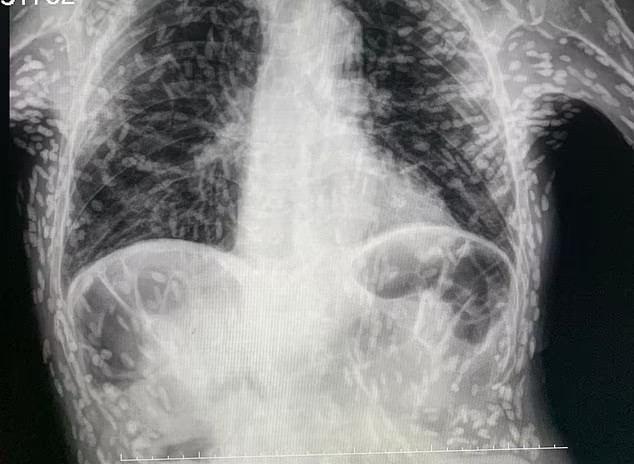 Theo Daily Mail, hình ảnh do bác sĩ Vitor Borin de Souza (Bệnh viện Clinicas in Botucatu, Brazil) cung cấp. Trên phim có hàng trăm đốm trắng, mỗi đốm đại diện cho phần bị vôi hóa của một loại ký sinh trùng.