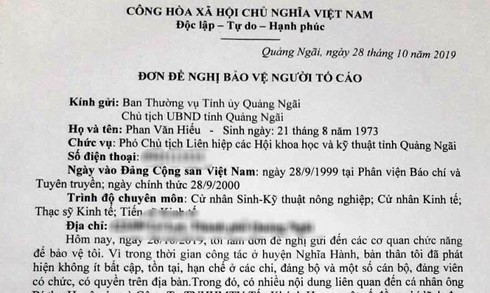 Trước đó, ông Phan Văn Hiếu, có đơn yêu cầu được bảo vệ tính mạng cho bản thân và gia đình đã gửi lên Ban Thường vụ Tỉnh ủy và Chủ tịch UBND tỉnh Quảng Ngãi.
