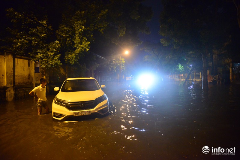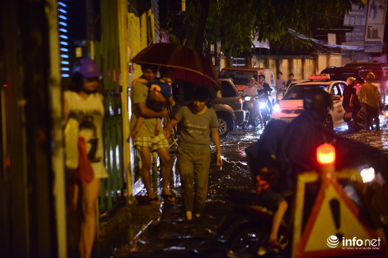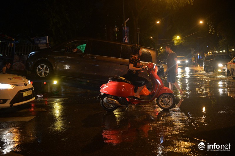Đến 19h30, dù mưa đã ngớt nhưng nước chưa rút kịp. Nhiều người dân và các phương tiện di chuyển khó khăn trong các tuyến phố nội đô. |