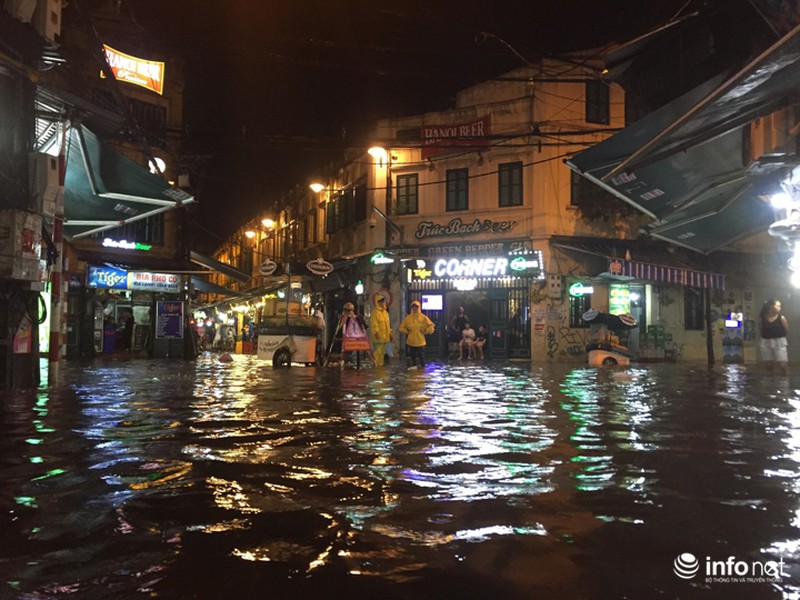 Ghi nhận của PV, tại khu vực phố cổ, một số tuyến phố như Hàng Bạc, Tạ Hiện, Lương Ngọc Quyến nước ngập chừng 30-50 cm. |