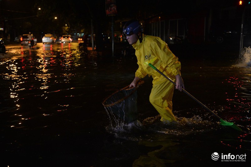 Đến 20h15, một đoạn tại khu vực ngã tư này vẫn bị ngập úng mặc dù các công nhân thoát nước đã có mặt kịp thời từ sớm để thoát nước. |