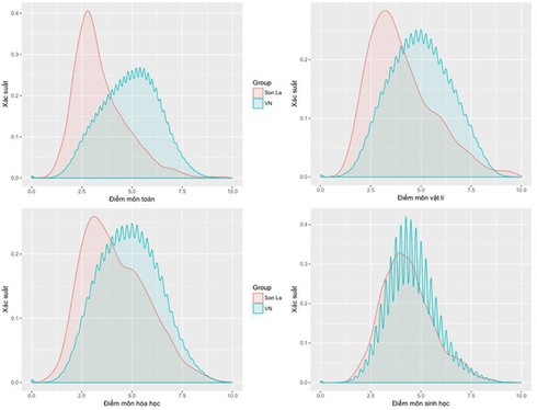 Phân tích phổ điểm của 8 môn học có thể thấy: Tính trung bình, điểm thi môn toán, lí, hóa và sinh học của Sơn La đều thấp hơn so với cả nước. Chẳng hạn như môn toán, điểm trung bình [độ lệch chuẩn] của Sơn La là 3.43 (1.33), so với cả nước là 4.88 (1.44). Điểm đáng chú ý là độ lệch chuẩn của Sơn La (1.33) thấp hơn so với cả nước (1.44).