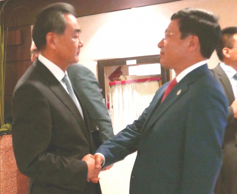 Phó Thủ tướng, Bộ trưởng Ngoại giao Phạm Bình Minh (phải) gặp Ngoại trưởng Trung Quốc Vương Nghị bên lề Hội nghị Ngoại trưởng ASEAN ngày 7-8 tại Manila, Philippines. (Nguồn: TTXVN) |