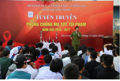 Công an tỉnh Quảng Ninh phối hợp với Sở Giáo dục và Đào tạo tổ chức tuyên truyền phòng chống ma túy, tội phạm tại trường THPT Đoàn Thị Điểm. (Ảnh: qtv.vn) |
