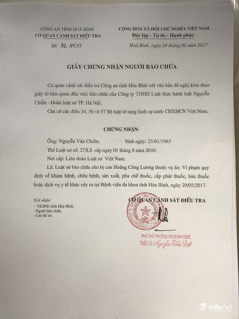 Giấy chứng nhận Luật sư Nguyễn Văn Chiến là người bào chữa cho BS Hoàng Công Lương. |