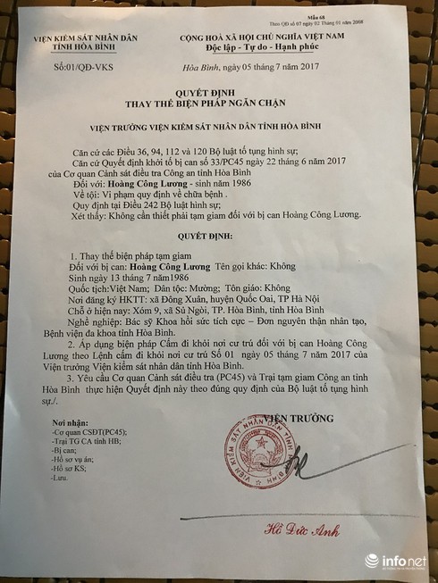 Quyết định cho BS Hoàng Công Lương được tại ngoại. |