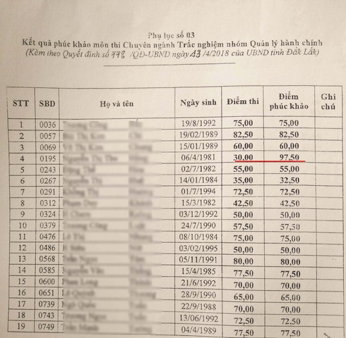 Đặc biệt, tại môn thi Chuyên ngành trắc nghiệm nhóm Quản lý hành chính, thí sinh SBD: 0195, tăng từ 30,00 lên 97,50 điểm (tăng 67,50 điểm), trong khi đó, những thí sinh khác cùng được chấm phúc khảo tại phần thi này đều không tăng điểm.