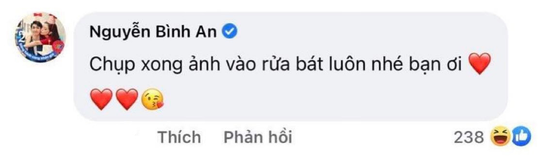 Dưới phần bình luận, người hâm mộ đã gửi lời chúc mừng hạnh phúc đến cặp đôi. Đáng chú ý, Bình An đã để lại bình luận trêu chọc bà xã của mình. Cụ thể, Bình An hài hước viết: “Chụp ảnh xong vào rửa bát luôn nhé bạn ơi”. Nàng hậu vừa mới về làm dâu mà chú rể đã khẳng định ai là “nóc nhà” rồi đây!