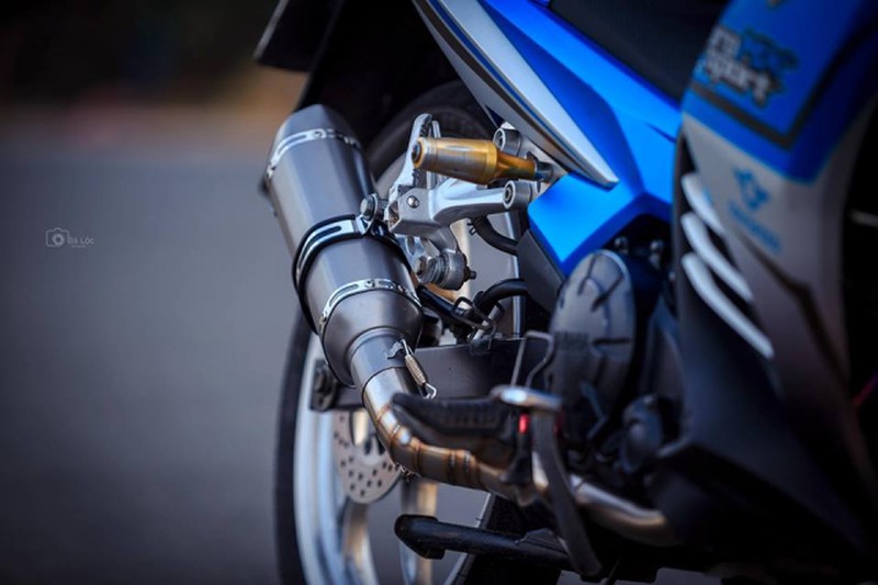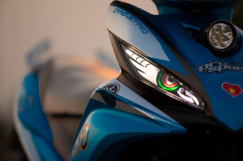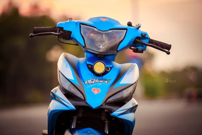 Chiếcxe độsở hữu tông màu xanh pha nhẹ cùng tông màu trắng xám, đi kèm với đó là bộ tem đấu rất sắc cạnh và lịch lãm. Chủ xe cũng không quên trang trí nhẹ cho phần đầu một tí đồ chơi để làm kiểng điển hình nhưbao tay Domino, chóa đèn chính được mod lại sử dụng bi cầu xe hơi cho ánh sáng xa và rộng khi vào các cung đường đêm. |