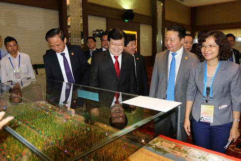 Phó Thủ tướng Chính phủ Trịnh Đình Dũng tham quan Triển lãm APEC về Sản phẩm lương thực và công nghệ mới trong nông nghiệp tại buổi đối thoại. |