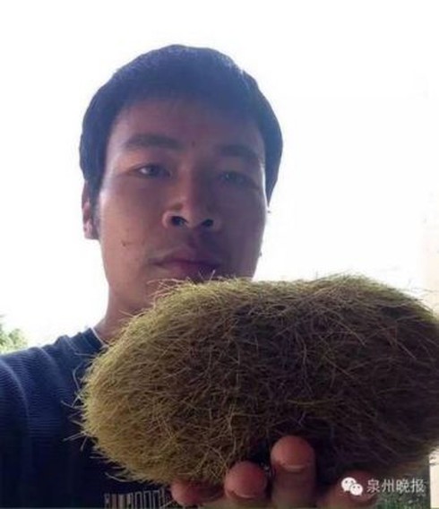 Anh Huang Wuzhi, người phát hiện ra "quả trứng lạ" hình bầu dục, xung quanh có nhiều sợi lông vàng xanh dài khoảng 2-3 cm. |