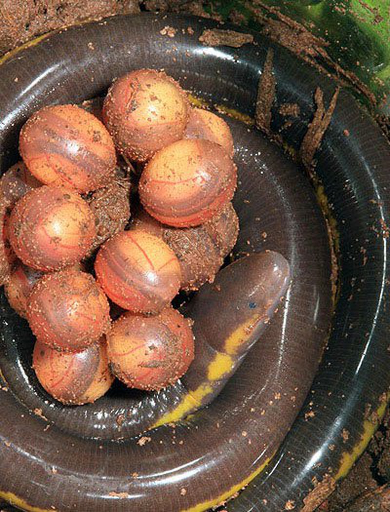 Chúng đẻ trứng ở gần chỗ có nước. Số lượng trứng trong một lứa có chừng 20 quả được nối với nhau bằng chất nhày và cá thể cái cuốn lấy để bảo vệ trứng khỏi khô đồng thời điều tiết nhiệt độ thích hợp để con non có cơ hội phát triển tốt nhất. (Ảnh: thetexanherper.com) |