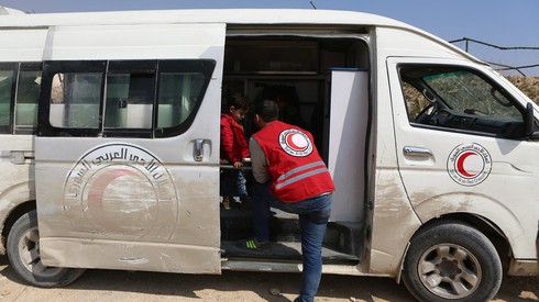 Nhân viên của tổ chức Lưỡi liềm Đỏ sơ tán dân thường ở Đông Ghouta hồi tháng Ba. |