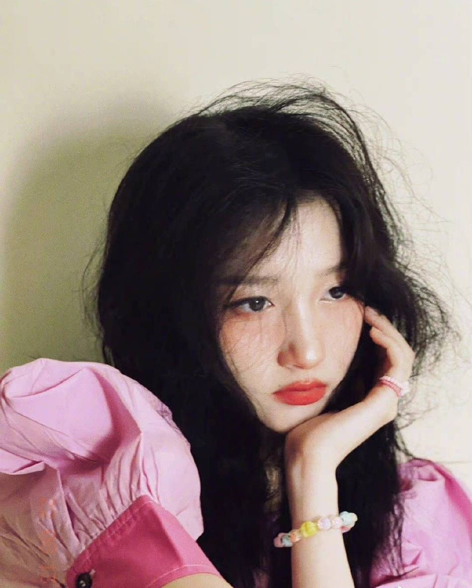 Quan Hiểu Đồng mặc trang phục màu hồng, khuôn mặt xinh đẹp, đôi môi đỏ rực, mái tóc đen bồng bềnh, một tay ôm má trông thật đáng yêu và quyến rũ.