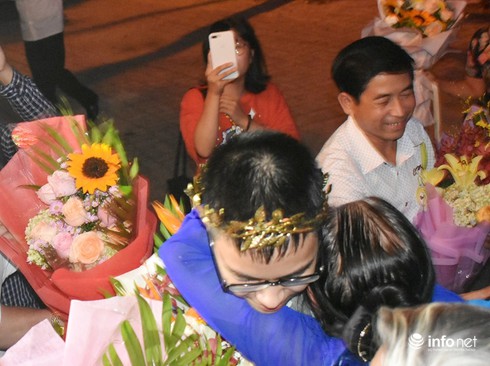 Đặc biệt, đại diện lãnh đạo Sở GD&ĐT tỉnh Nghệ An, UBND TP. Vinh và rất nhiều đoàn thể cũng đến tặng hoa và chúc mừng em Trung lần đầu mang vinh quang trở về.