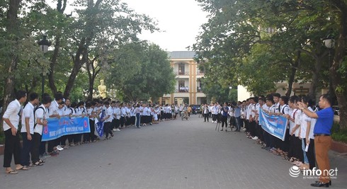 Hàng trăm học sinh trường THPT chuyên Phan Bội Châu có mặt từ rất sớm để đón chào quán quân Đường lên đỉnh Olympia. |