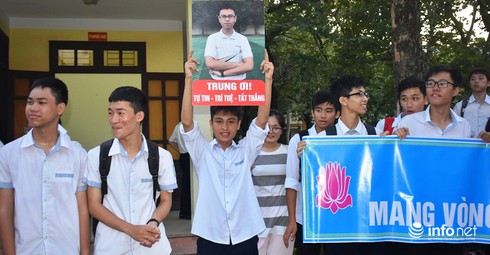 | Em Trần Thế Trung trở về trong niềm tự hào của các học sinh, thầy cô giáo của Trường THPT chuyên Phan Bội Châu. |