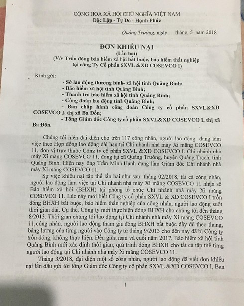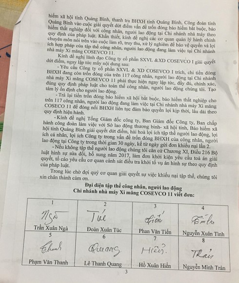 117 người lao động tại Chi nhánh nhà máy xi măng Cosevco11 gửi đơn tới các cơ quan. |