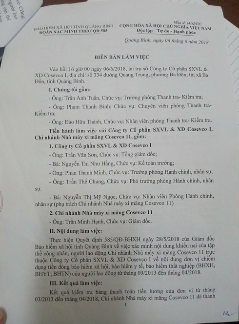 Các cơ quan đã có rất nhiều cuộc làm việc với Công ty cổ phần SXLV&XD Cosevco 1 về việc chiếm dụng tiền đóng bảo hiểm của người lao động. |