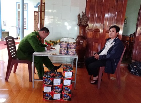 Khoảng hơn 1 giờ sau, lực lượng Cảnh sát kinh tế Công an huyện Quảng Ninh phối hợp đơn vị nghiệp vụ thuộc Công an tỉnh Quảng Bình và Đồn Công an Nam Long phát hiện và bắt quả tang đối tượng Lê Minh Khoa (sinh năm 1973, trú tại thôn Đức Thắng, xã Gia Ninh, huyện Quảng Ninh) đang có hành vi vận chuyển 24 hộp pháo, có trọng lượng 32kg để giao đối tượng Lê Mạnh Tùng (sinh năm 1990, trú tại thôn Tân Hiền, xã Hiền Ninh, huyện Quảng Ninh).