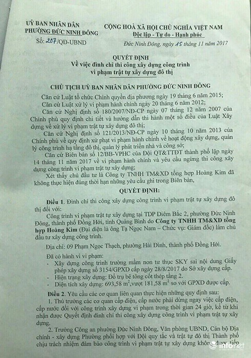 Ngày 15/11/2017, ông Bùi Minh Triển-Chủ tịch phường Đức Ninh Đông ký Quyết định số 207/QĐ-UBND về việc đình chỉ thi công xây dựng công trình vi phạm trật tự xây dựng đô thị” đối với công trình xây dựng Trường mầm non tư thục SKY.