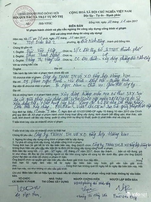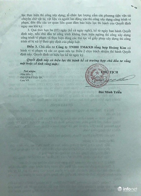 Đội Quy tắc và Trật tự đô thị đã yêu cầu “công ty Hoàng Kim ngừng thi công xây dựng công trình vi phạm trật tự xây dựng. Tự phá dỡ công trình xây dựng, bộ phận công trình vi phạm. Trong thời gian 24 giờ kể từ khi lập biên bản, công ty Hoàng Kim không thực hiện các yêu cầu nêu trên thì bị đình chỉ thi công xây dựng công trình vi phạm”.