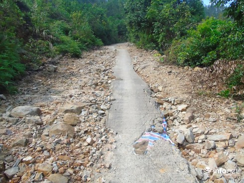 Xã phải trích kinh phí làm đường nhỏ 1m cho xe máy qua lại, nhưng cũng bị mưa làm hư hỏng. |