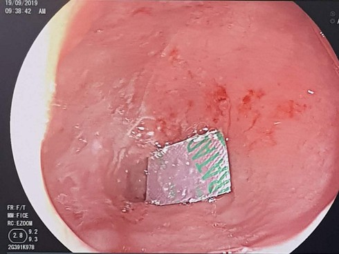 Tiến hành nội soi tiêu hóa, các bác sỹ đã phát hiện tại tá tràng có viên thuốc còn nằm trong vỏ kích thước 1x1.5cm, cạnh sắc nhọn, gây tổn thương niêm mạc ruột nên đã tiến hành gắp dị vật thành công.