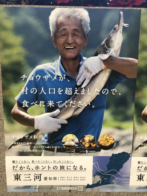 Trong tờ quảng cáo, một người đàn ông tóc đã bạc trắng nở nụ cười tươi ôm con cá tầm rất to cùng dòng chữ "Cá tầm đã nhiều hơn cư dân ở đây rồi, hãy đến và ăn một vài con nào".