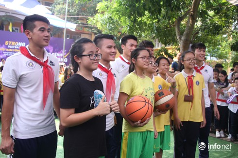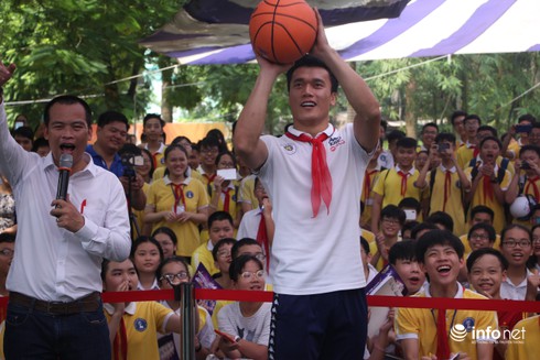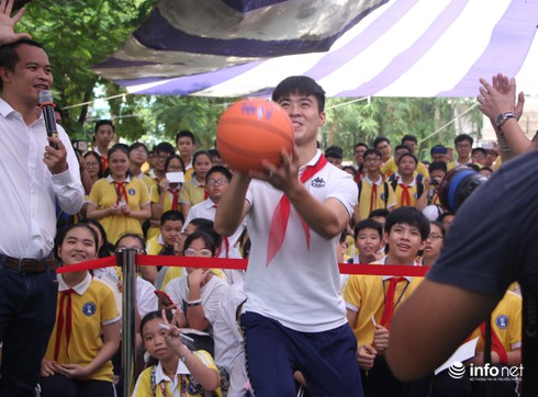 Cuối chương trình, các thành viên của Hà Nội FC là tiết mục thi ném bóng rổ cùng các em học sinh THCS Nguyễn Trường Tộ.