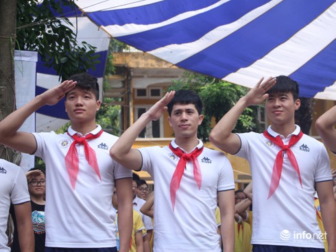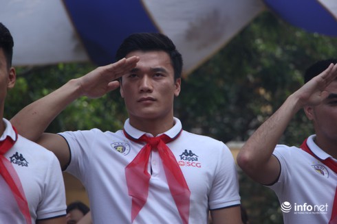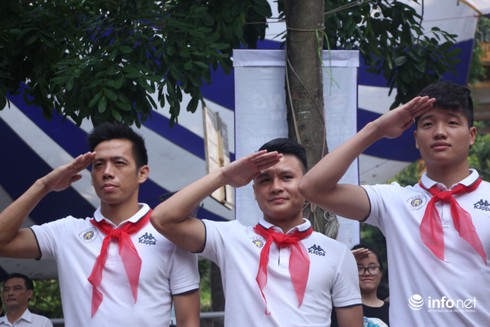 Trước khi diễn ra buổi giao lưu của 11 cầu thủ CLB bóng đá Hà Nội và học sinh toàn trường, các cầu thủ và các em học sinh đã thực hiện nghi lễ chào cờ sáng thứ 2 đầu tuần hết sức ý nghĩa.